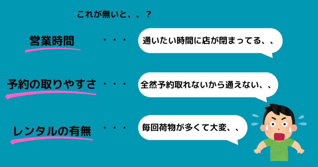 「営業時間・予約の取りやすさ・レンタルの有無」です。